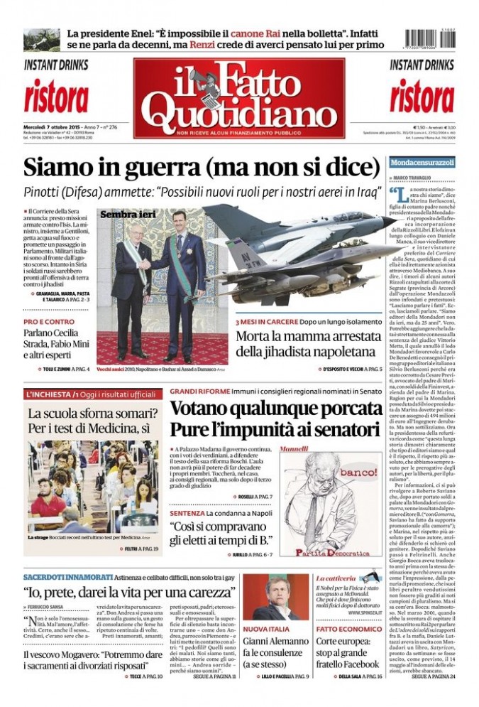 Siamo in guerra (ma non si dice) Pinotti (Difesa) ammette: “Possibili nuovi ruoli per i nostri aerei in Iraq” Il Corriere della Sera annuncia: presto missioni armate contro l’Isis. La ministro, insieme a Gentiloni, getta acqua sul fuoco e promette un passaggio in Parlamento. Militari italiani sono al fronte dall’ago - sto scorso. Intanto in Siria i soldati russi sarebbero pronti all’offensiva di terra contro i jihadisti