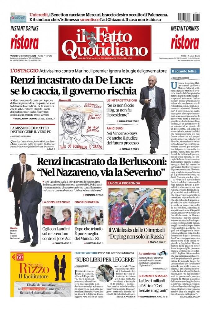 L’O S TAG G I O Attivissimo contro Marino, il premier ignora le bugie del governatore Renzi incastrato da De Luca: se lo caccia, il governo rischia p Mentre escono le carte con le prove della compravendita – da parte dei suoi fedelissimi faccendieri – della sentenza che lo salvò, Palazzo Chigi fa i conti dei parlamentari da lui controllati o suoi alleati tramite Denis Verdini