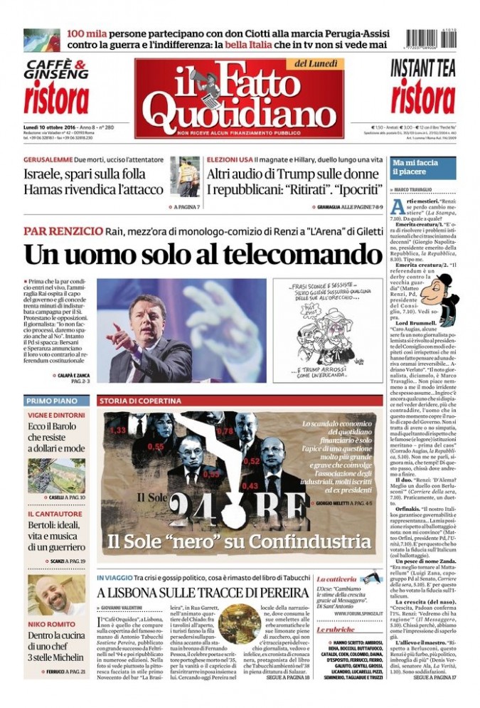 PAR RENZICIO Rai1, mezz’ora di monologo-comizio di Renzi a “L’A re n a ” di Giletti Un uomo solo al telecomando Prima che la par condicio entri nel vivo, l’ammi - raglia Rai ospita il capo del governo e gli concede trenta minuti di indisturbata campagna per il Sì. Protestano le opposizioni. Il giornalista: “Io non faccio processi, daremo spazio anche al No”. Intanto il Pd si spacca: Bersani e Speranza annunciano il loro voto contrario al referendum costituzionale
