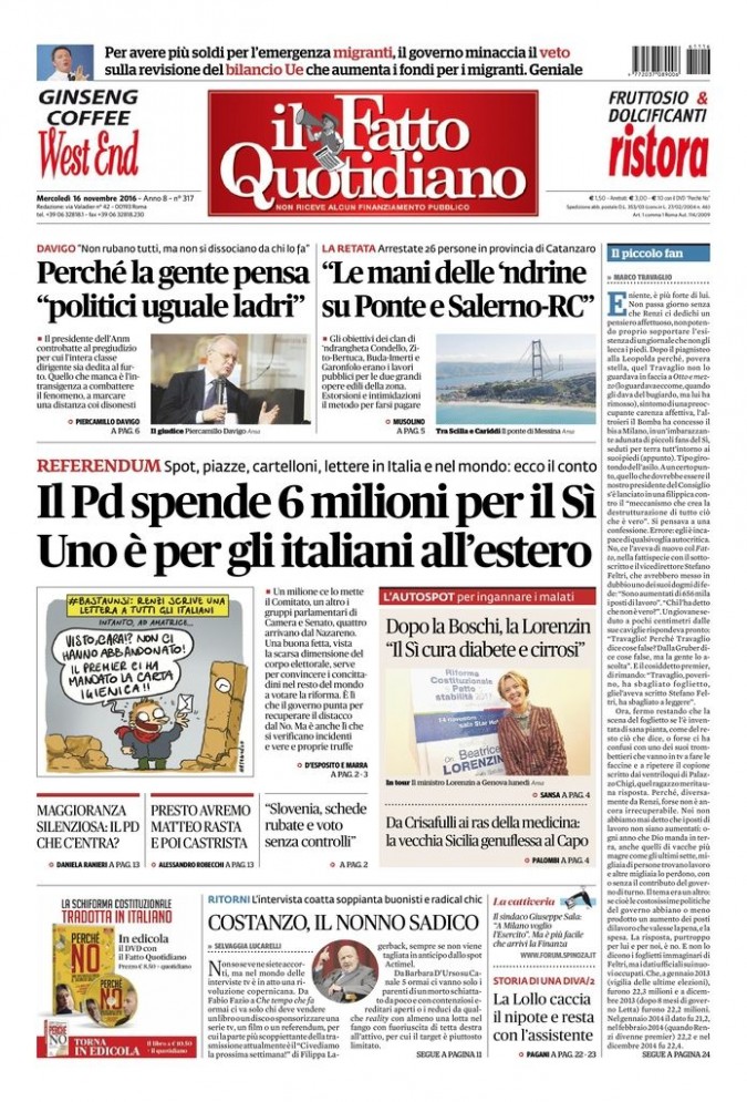 REFERENDUM Spot, piazze, cartelloni, lettere in Italia e nel mondo: ecco il conto Il Pd spende 6 milioni per il Sì Uno è per gli italiani all’e s te ro Un milione ce lo mette il Comitato, un altro i gruppi parlamentari di Camera e Senato, quattro arrivano dal Nazareno. Una buona fetta, vista la scarsa dimensione del corpo elettorale, serve per convincere i concittadini nel resto del mondo a votare la riforma. È lì che il governo punta per recuperare il distacco dal No. Ma è anche lì che si verificano incidenti e vere e proprie truffe