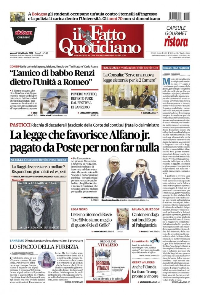 PASTICCI Rischia di decadere il fascicolo della Corte dei conti sul fratello del ministro La legge che favorisce Alfano jr. pagato da Poste per non far nulla Per l’assunzione del giovane Alessandro a dirigente di Postecom, la società rischiava di incorrere nel danno erariale. Ma un decreto sulle “società a partecipazione pubblica” porta fuori dal perimetro statale anche la ditta che gli ha fornito il lavoro. Il risultato è che nessuno sarà più multato per quella “promozione"
