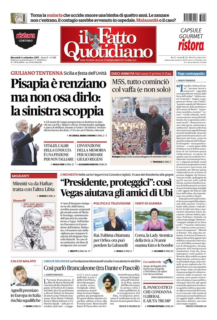 GIULIANO TENTENNA Sicilia e festa dell’Unità Pisapia è renziano ma non osa dirlo: la sinistra scoppia Gli atomi di Campo progressista si dividono in due: chi sta con Pd e Alfano e chi no. Il mini-leader ondeggia e spera di defilarsi. Intanto è l’unico “di sinistra” invit ato alla kermesse dei dem: c’è il veto su D’Alema e Bersani