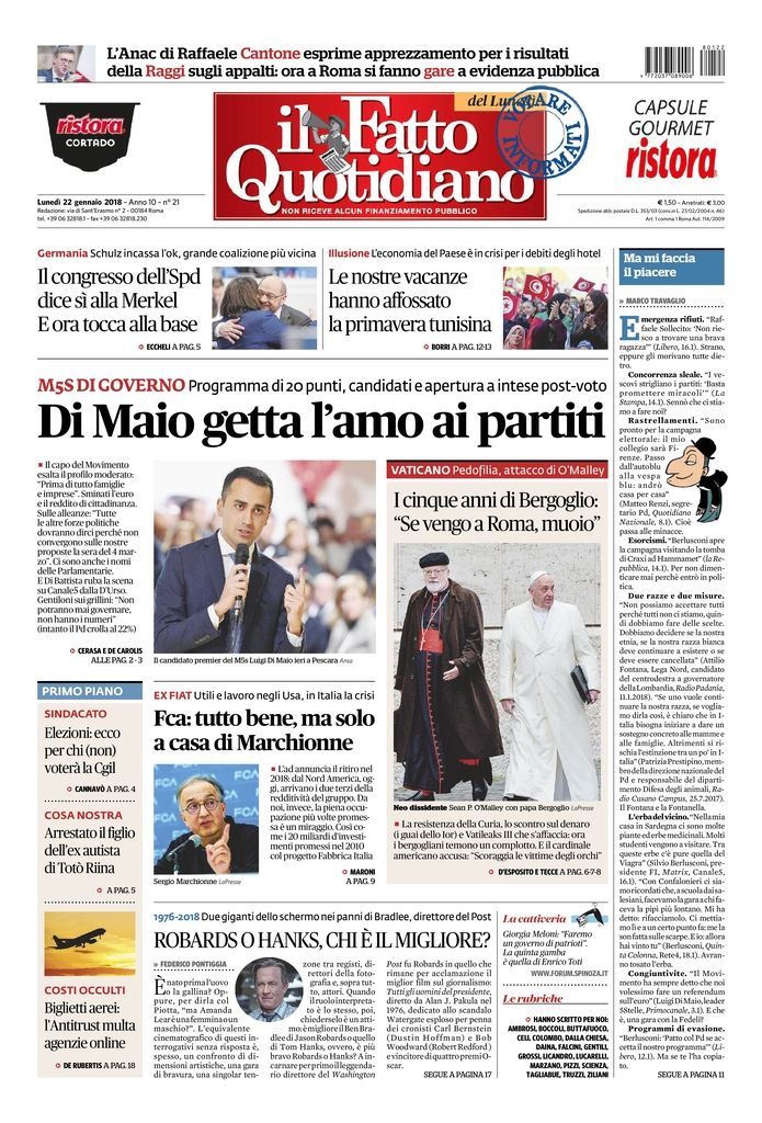 M5S DI GOVERNO Programma di 20 punti, candidati e apertura a intese post-voto Di Maio getta l’amo ai partiti. Il capo del Movimento esalta il profilo moderato: “Prima di tutto famiglie e imprese”. Sminati l’e u ro e il reddito di cittadinanza. Sulle alleanze: “T u t te le altre forze politiche dovranno dirci perché non convergono sulle nostre proposte la sera del 4 marz o”. Ci sono anche i nomi delle Parlamentarie. E Di Battista ruba la scena su Canale5 dalla D’Ur s o. Gentiloni sui grillini: “Non potranno mai governare, non hanno i numeri” (intanto il Pd crolla al 22%).
