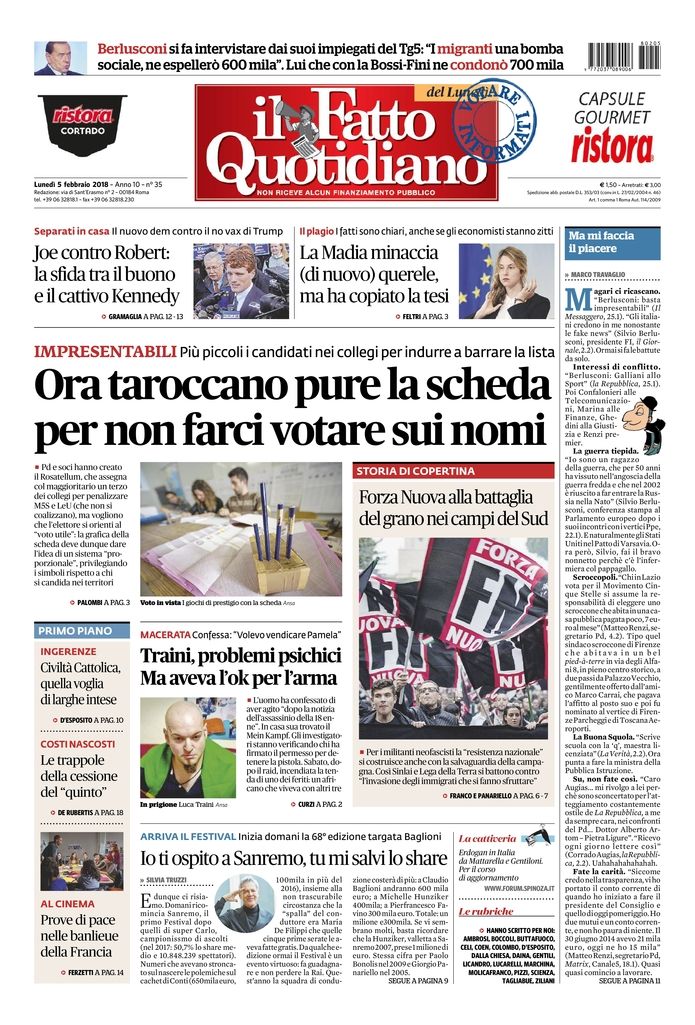 IMPRESENTABILI Più piccoli i candidati nei collegi per indurre a barrare la lista Ora taroccano pure la scheda per non farci votare sui nomi Pd e soci hanno creato il Rosatellum, che assegna col maggioritario un terzo dei collegi per penalizzare M5S e LeU (che non si coalizzano), ma vogliono che l’elettore si orienti al “voto utile”: la grafica della scheda deve dunque dare l’idea di un sistema “proporzionale ”, privilegiando i simboli rispetto a chi si candida nei territori