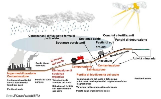 Il JRC stima per l’Italia una perdita di suoloper erosione idrica superiore a 8,50 tonnellate/ettaro*anno (la media europea è di circa 2,46 tonnellate/ettaro*anno).