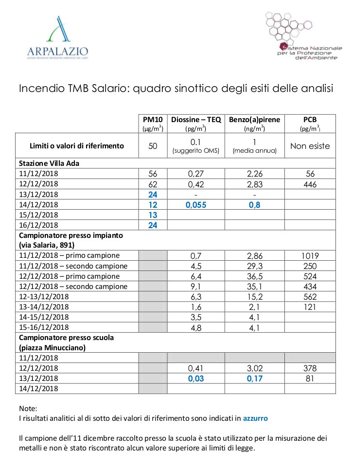 Incendio #TMBSalario, riuniti in una tabella tutti i dati emersi finora da campionamenti e analisi di laboratorio. Aggiornamenti, non appena disponibili, pubblicati su http://www.arpalazio.gov.it/servizi/eventi/
