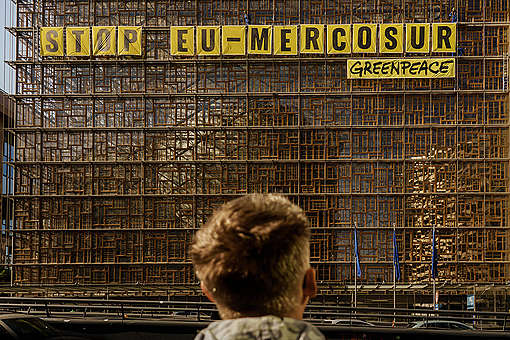Greenpeace irrora con finti pesticidi il Consiglio del commercio europeo per protesta contro l'accordo UE-Mercosur